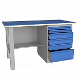 Однотумбовый. Допустимая нагрузка на столешницу 750 кг. Опорные элементы выполнены сварными из холоднокатаной стали. Для выполнения сборочных, ремонтных, слесарных, монтажных и других видов работ на производстве, в сервисных центрах, мастерских, гаражах, а также для обучения технологии в учебных заведениях. Комплектуется полкой-стенкой, расположенной под столешницей для удобного размещения габаритного инструмента и оснастки. Размеры верстака: 855x1596x696 мм. Вес: 68 кг. Поставляется в 4 комплектациях на выбор.