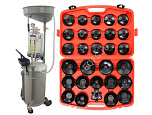 Комплект из TS-2097 маслосборника. Для быстрого слива и откачки щупами масла и антифриза из ДВС, КПП и дифференциалов всех авто. В комплекте: Колба с особо прочным пластиком. Сливная чаша с сеткой для улавливания мелких деталей. Щупы гибкие 6 шт. Лоток для сливной пробки. Прозрачная трубка контроля в защитном кожухе. Металлические пистолеты для откачки масла. Вмещает 90 л. = Бак 70л + колба 10 л. + сливная воронка 10л + ES0903 Набор съемников масляных фильтров ("чашки") - 30 шт.