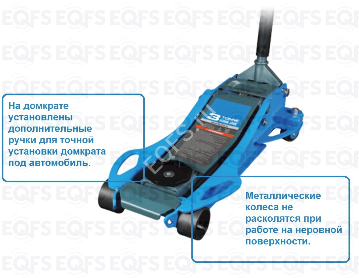 .         Увеличенный диаметр металлических колес домкрата, позволяет легко транспортировать его по не ровным поверхностям.