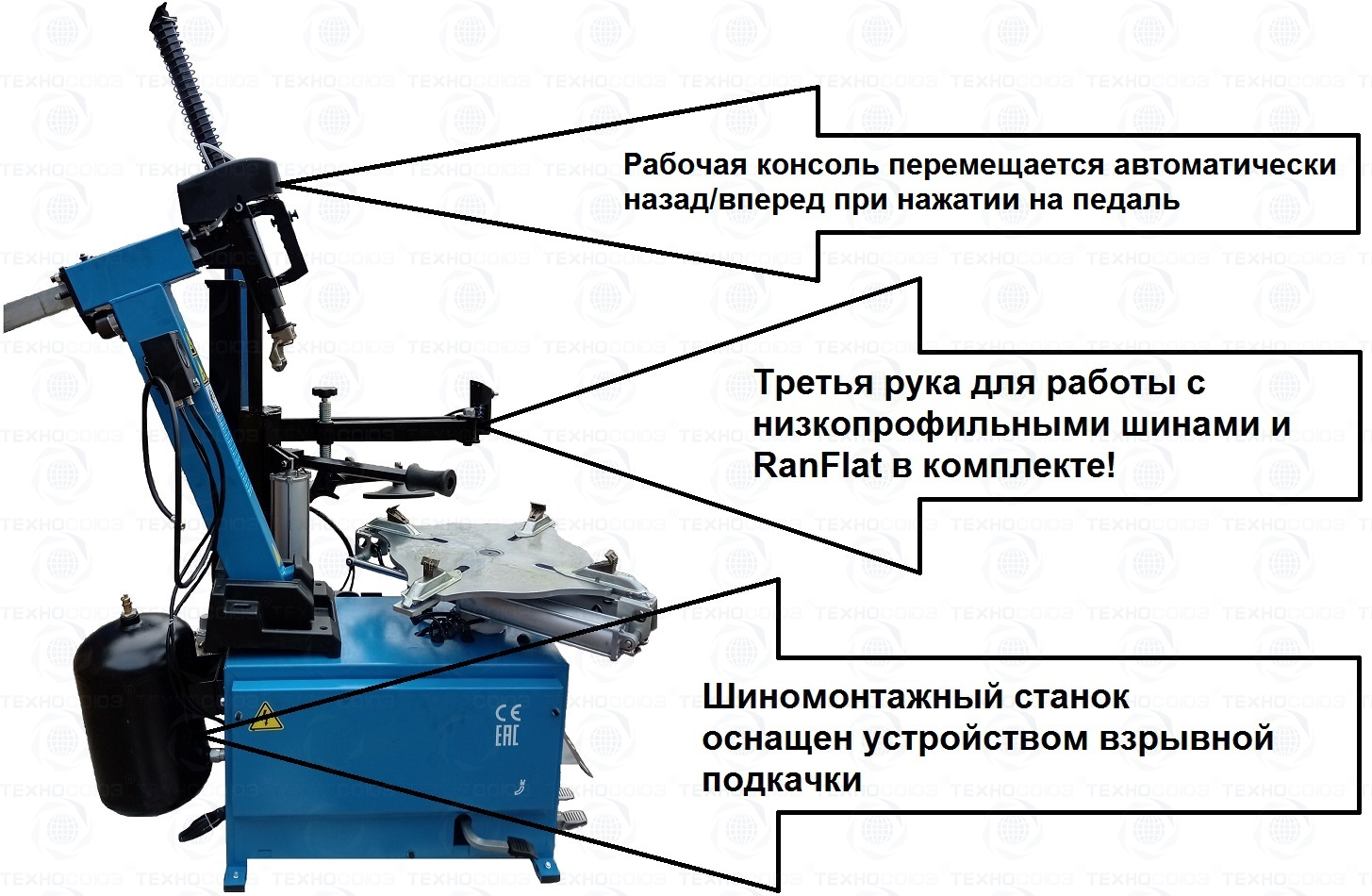 автоматического шиномонтажного стенда TS-3226А. Предназначен для монтажа и демонтажа шин легковых автомобилей, внедорожников и легких грузовиков с размером колес от 11-24 дюйма. Усилие пневмоцилиндра в 2500 кг. В комплекте: полноценная 3-й рука для работы с жесткой и низкопрофильной резиной RUNFLAT. + встроенный бустер  24 литра (взрывная подкачка) + пистолет для подкачки шин + монтажка + регулятор давления с влагоотделителем и манометром.