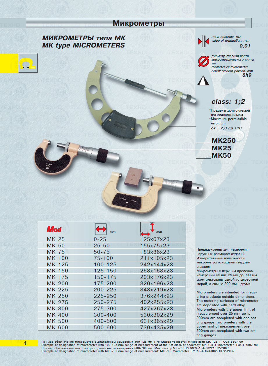 Цена деления 0,01 мм. Диапазон измерения от 50-75 мм. Для измерения наружных размеров изделий. Измерительные поверхности микрометра оснащены твердым сплавом. Микрометры укомплектованы одной установочной мерой. Класса точности 2. ГОСТ 6507-90. Поставляется в двух вариантах с поверкой и без поверки!