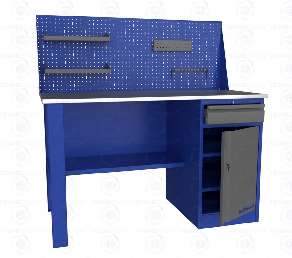 Для организации рабочих мест в автосервисах, мастерских, цехах и т.д., компания разработала линейку верстаков и рабочих столов. Основания этих изделий изготовлены из листового металла и покрыты порошковой краской. Столешницы сделаны из фанеры толщиной 24 мм. и обшиты оцинкованным металлом толщиной 1 мм. Cтолешница 1400 мм (фанера 24 мм + оцинкованный металл 1 мм), опора, тумба с ящиком и дверью, полка-стенка.