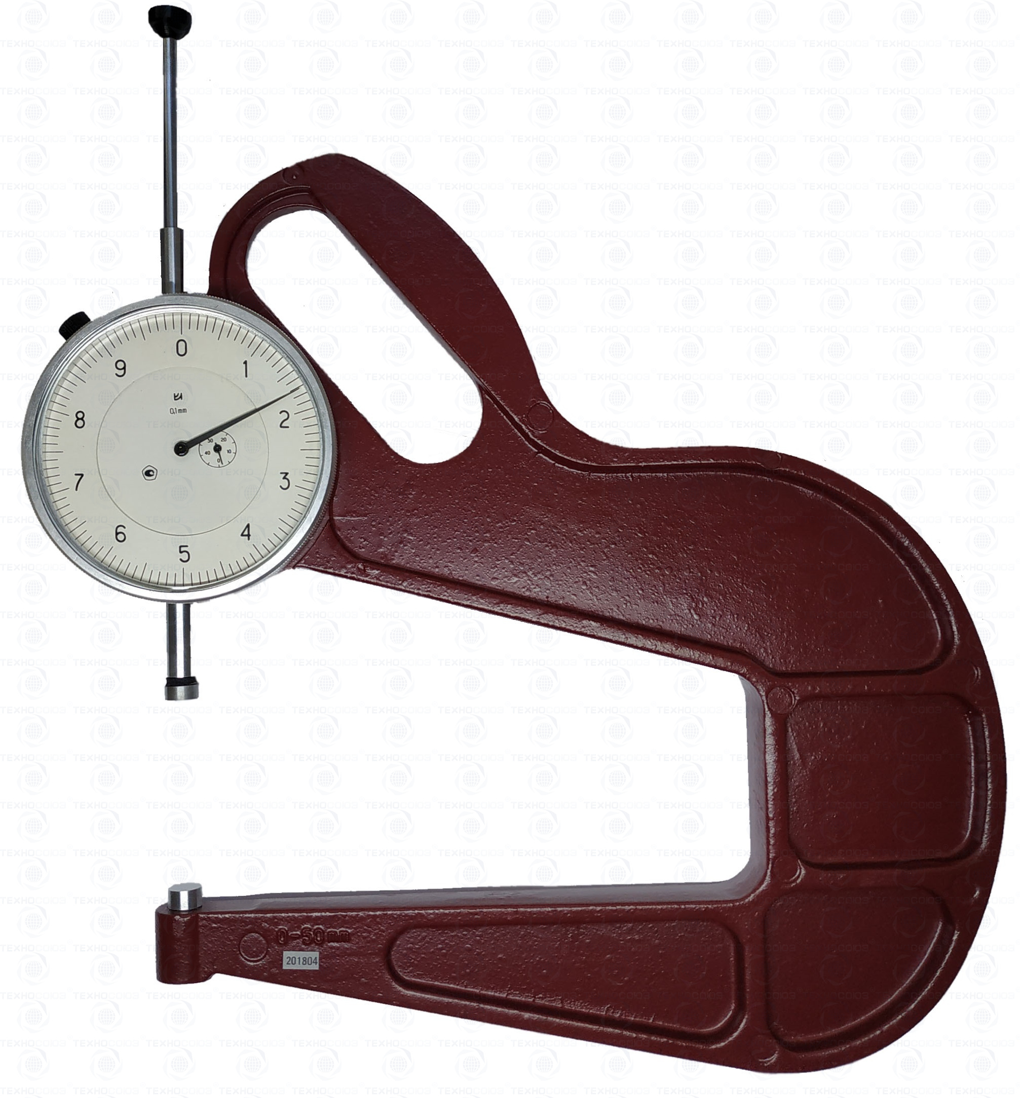 Толщиномер представляет собой скобу, в которой сверху расположено отсчетное устройство с измерительным наконечником , а снизу запрессована пятка. У толщиномера с нормированным измерительным усилием для установки измерительного стержня отсчетного устройства в рабочее положение имеется арретир (отводка).